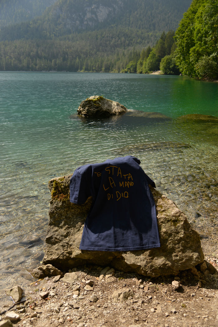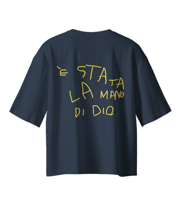 Camiseta azul marino con el emblema “È stata la mano di Dio” en amarillo garabateado como si lo hubieran escrito en los muros de la historia.